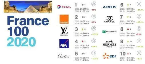 前不久,全球知名品牌评估机构Brand Finance发布了“2020年法国最有价值的100大品牌”排行榜。从榜单还可以看到LV、卡地亚、空客、香奈儿、爱马仕等我们耳熟能详的品牌进入前十。法国100强品牌,总价值达到3758亿欧元。