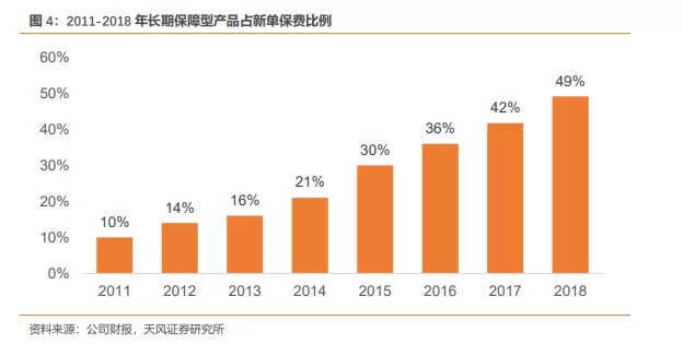 2、期限及产品结构:个险期交业务高速增长;长期保障型占比提升。期限结构方面,转型期太保的个险期交业务高速增长(2010-2018年复合增长率达22.5%),个险期间保费占比从2011年21%提升至2018年74%,驱动寿险新业务价值与价值率持续增长。产品结构方面,太保坚持以长期健康险发展为主,代理人渠道的长期保障型产品增速快于长期储蓄型产品增速,长期保障型产品的新单保费占比大幅提升,由2011年10%升至2018年49%。