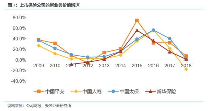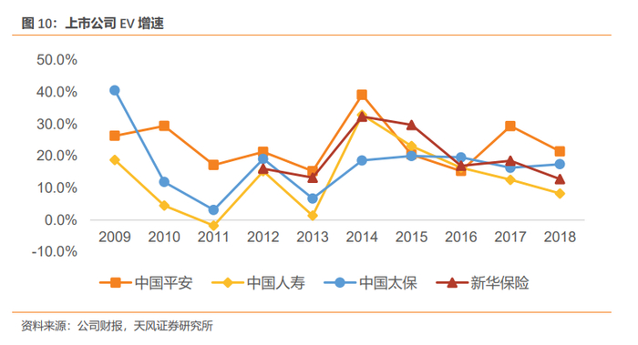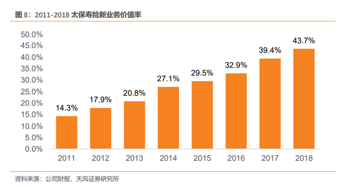 4、新业务价值增速领先同业,新业务价值率持续提升。转型1.0以来,太保寿险业务结构和业务质量不断优化,个险渠道保费收入持续增长、个险期缴占比提升、长期保障型业务发展迅速,驱动新业务价值同比增速领先同业,2010-2018年公司新业务价值复合增长率高达21.2%,高于国寿(12.1%)、平安(20.5%)、新华(12.6%);新业务价值率从2011年14.3%上升至2018年43.7%,领先上市同业。