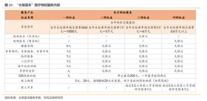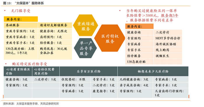 “太保蓝本”是“保险+健康”服务生态圈的重要载体,自2019年推出以来,已累计覆盖约1000万人。“太保蓝本”打造的多层次的医疗服务体系包括:1、无门槛即可享受的重疾绿通服务,作为代理人获客工具;2、特定医疗险享受的服务,提升客户从短险向长险的转化;3、长险客户可享受的医疗特权服务,有助于推动长险件均的提升及客户加保。其中,太保蓝本医疗特权服务提供升级版的医疗服务,为不同保费级别的客户提供覆盖诊前、诊中、诊后的医疗协助服务。