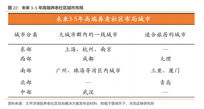 中国太保养老社区依据“聚焦集团保险主业高地城市、聚焦长三角等经济区域中心城市群、聚焦人口老龄化重度城市”的原则进行布局,按照“南北呼应、东西并进、全国连锁”的思路,加快推进6个城郊型和度假型高端养老社区项目落地。计划投资100亿完成养老产业初始阶段的布局,其中70亿建设城郊大型CCRC养老社区,30亿建设城市中小型康养项目。