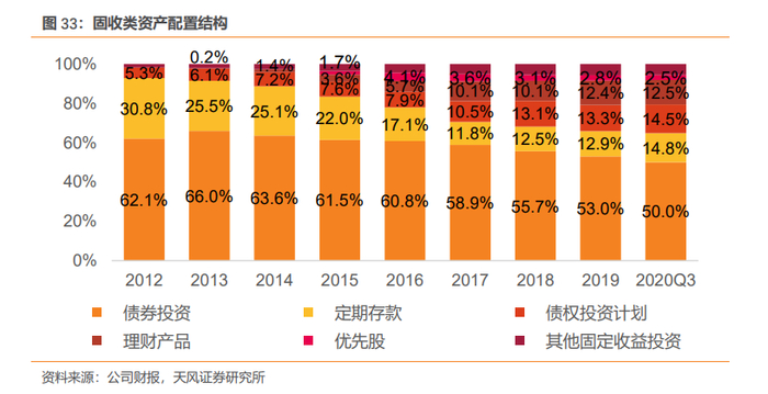 近年来减配债券,加配债权投资计划等非标类资产。从固定收益类资产的构成来看:1)债券投资占比最高,配置占比略有下降,从2012年的62.1%降至2020Q3的50.0%,但国债、地方政府债、政策性金融债占债券投资的比重上升。2020年6月末国债、地方政府债、政策性金融债占投资资产的 16.4%,较上年末增长 0.2 个百分点,平均久期为 15.3 年,较上年末增加 0.1 年。2)定期存款比重逐年下降,从2012年的30.8%逐年下降至2019年末的12.9%,2020年占比有所提升;3)债权投资计划、理财产品等非标资产配置显著上升,债权投资计划从2012年的5.3%上升至2020年3季度的14.5%,理财产品从2013年的0.2%上升至2020年3季度的12.5%,优先股配置占比升至2.5%。