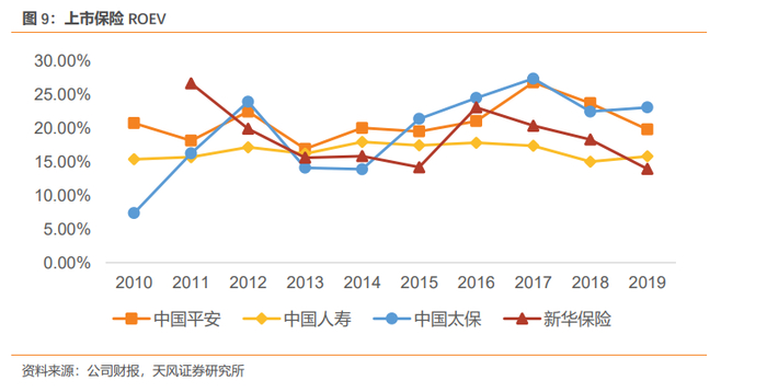 5、EV及 ROEV稳定增长。2011年以来,太保EV增长平稳,2011-2018年集团内含价值CAGR达到16.8%,太保寿险内含价值CAGR达19.8%;2011-2018年,投资收益差异、营运经验差异年均偏差分别为-4.2、3.11亿元,平均投资收益偏差率-1.1%、营运经验偏差率0.19%,精算假设较为谨慎合理。ROEV保持平稳,2011-2018年均值为20.4%,仅次于平安(21.0%),高于国寿(16.8%)、新华(19.2%)。