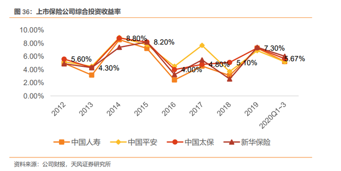 公司的投资收益率总体优于行业平均,且波动幅度低、稳定性更强。2011-2020年前3季度,太保净投资收益率均值为5.0%,仅次于平安(5.1%),优于新华(4.9%)、国寿(4.6%);太保总投资收益率为5.1%,仅次于平安(5.2%),优于新华(5.0%)、国寿(4.6%)。2012-2020年前3季度,太保综合投资收益率均值为5.97%,略低于平安(6.04%),优于新华(5.5%)、国寿(5.2%)。此外,波动幅度角度,太保投资收益率稳定性显著优于同业。