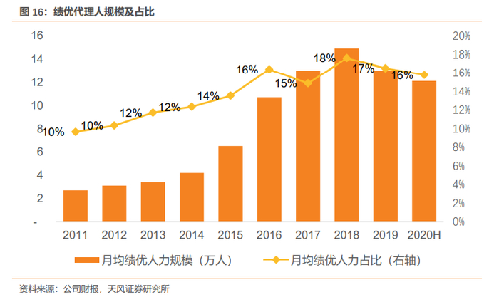 自2018年公司开始进行转型2.0以来,正好遭遇了行业调整期,短期业绩压力及转型压力并存。公司稳步推进转型项目,在代理人分层经营、优增强训及科技赋能、服务赋能等方面积极布局,但转型举措短期未体现在业绩表现上。同时,为实行长期转型,公司亦让渡了短期利益,在财力、人力等资源方面向长期战略倾斜,也使得公司在2018-2020年负债端持续承压。