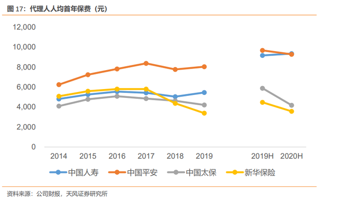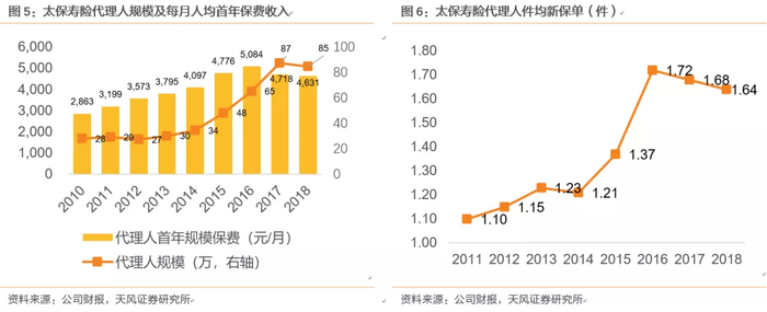 3、代理人量质齐升。代理人每月人均首年保费收入从2010年2863元升至2017年4853元,人均新保单从2011年1.10件升至2017年1.68件。