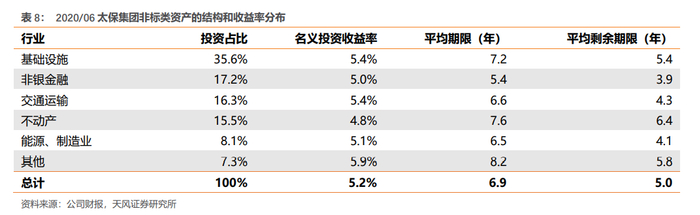 非标类资产风险管控优异,提升净投资收益率水平。截止2020年上半年,在企业债及非政策性银行金融债中债项或其发行人评级 AA/A-1级及以上占比达 99.8%,其中,AAA 级占比达 93.7%。非标资产中,具有外部信用评级的非公开市场融资工具占100%,其中 AAA 级占比达 94.7%,AA+ 级及以上占比达 99.9%。高等级免增信的主体融资占 51.8%,其他项目都有担保或抵质押等增信措施。从行业分布看,非标融资项目分散于基础设施、非银金融、交通运输、不动产等行业,主要集中于北京、上海、广东、江苏等经济发达地区。目前公司非标资产平均期限6.9年,名义平均投资收益率5.2%,预计未来净投资收益有下行压力的背景下,公司有望保持净投资收益率稳定。