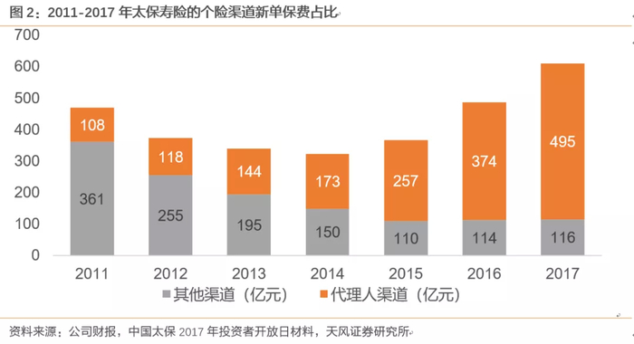 1)放弃占比过半的银保渠道短期趸交业务,确立了转型的先发优势。太保于2014年撤销银保渠道,将其与原来的团险渠道合并为法人渠道;2015年将所有需要在银行柜台进行的业务取消,专注于银行后台业务,即可以接入银行后台的业务,例如借款人意外险等。