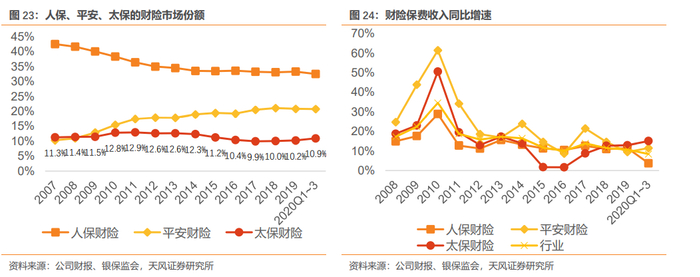财险行业CR3格局依然稳固,太保财险市占率出现向上拐点。自90年代起,财险行业就已形成人保、太保、平安“老三家”争霸的局面,2009年进入“70号文”盈利周期后,人保弃规模保利润,而平安产险凭借电销市场份额迅速跃升,太保市占率则基本维持平稳,“老三家”的财险龙头格局多年来基本维持稳定。2018年以来,太保财险市场份额出现向上拐点。
