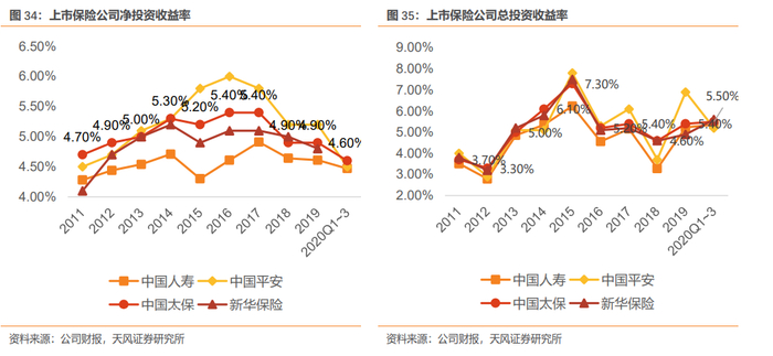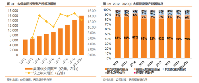 固收类资产占比高,投资风格稳健。截至2020年9月,集团总投资资产达15996亿元,较上年末增长12.7%。从资产配置来看,近几年固定收益类资产占比略有下降,但始终保持在80%左右,高于其他公司;股票及权益型基金配置较少,常年居于上市同业最低位,投资风格稳健。