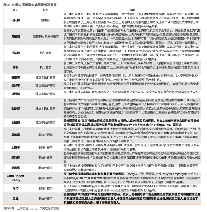 董事会成员构成进一步丰富,预计治理结构更趋国际化、市场化。今年太保引入陈然先生、John Robert Dacey先生、梁红女士为公司董事会非执行董事,引入刘晓丹女士为独立非执行董事。其中:1)陈然先生为上海欧冶金融信息服务股份有限公司董事、总经理;东方付通信息技术有限公司执行董事、中合中小企业融资担保股份有限公司董事;2)John Robert Dacey先生为瑞士再保险集团首席财务官、执行委员会委员;3)梁红女士为高瓴旗下产业与创新研究院院长。此前太保董事会的非执行董事多数来自上海国资体系;4)刘晓丹女士现任晨壹投资(北京)有限公司总经理,曾任华泰联合证券有限责任公司总裁、董事长。我们判断,太保董事会成员趋于多元化与专业化的背景,将利于公司完善治理机制,提升经营能力,为后续公司业务发展提供战略和资源上的帮助。