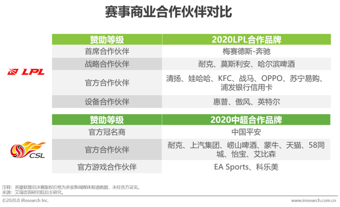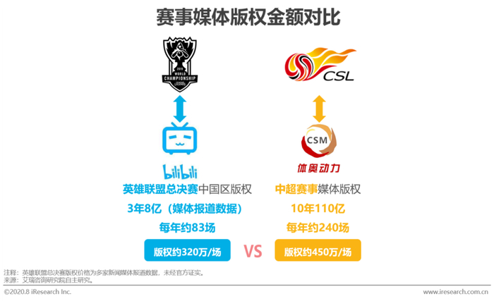 随着电竞赛事用户规模和社会影响力提升,电竞赛事的商业化价值越来越得到主流市场认可。对比国内头部传统体育赛事(以中超为例)和头部电竞赛事(以英雄联盟LPL为例),电竞赛事合作品牌在知名度与数量上已经和传统体育赛事相当,同时,随着顶尖电竞赛事的联盟化发展,电竞赛事的版权价值和整体商业价值也越来越向传统体育赛事靠拢。