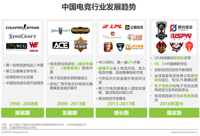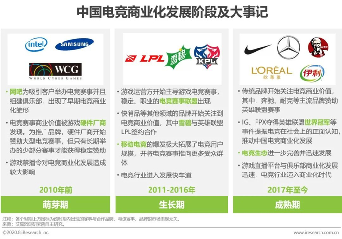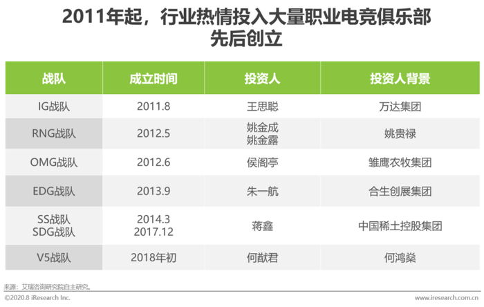 2011年起,随着第一方电竞赛事起步,与电竞一同成长的中国富二代们成为电竞行业领路人,依靠对电竞的热情投入创立众多知名职业电竞俱乐部。2017年起,随着电竞赛事用户规模与曝光量不断扩大,社会资本越来越关注电竞赛事这片价值洼地,通过成立电竞俱乐部,实现电竞行业布局并占领产业链上游。电商、视频、游戏、运动、硬件等品牌基于年轻用户获取、品牌声量提升、主营业务联动等目的,纷纷进入电竞行业,加速了电竞商业化前进步伐。