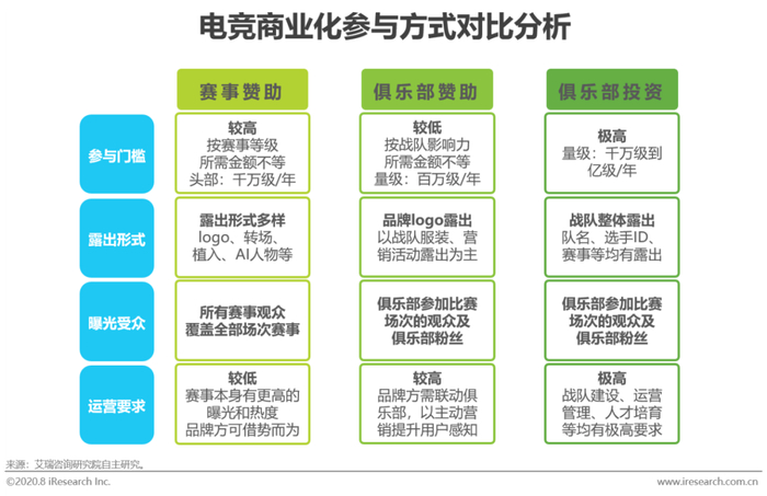 模式:赛事赞助、俱乐部赞助、俱乐部投资为品牌参与电竞赛事主要模式。品牌主可根据自身需求与能力选择如何进入电竞领域,达到电竞营销效果。
