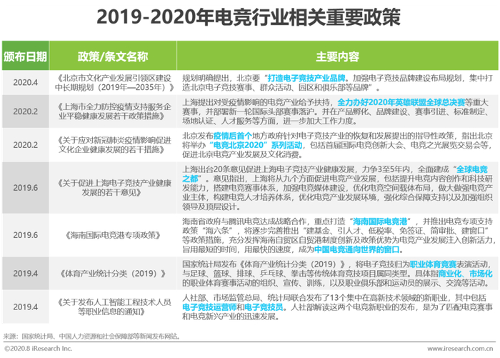 政策:电竞被国家归入职业体育竞赛表演活动,电子竞技员和电子竞技运营师成为官方发布新职业。多地发布电竞产业扶持政策,推动电竞与城市文化共同发展。