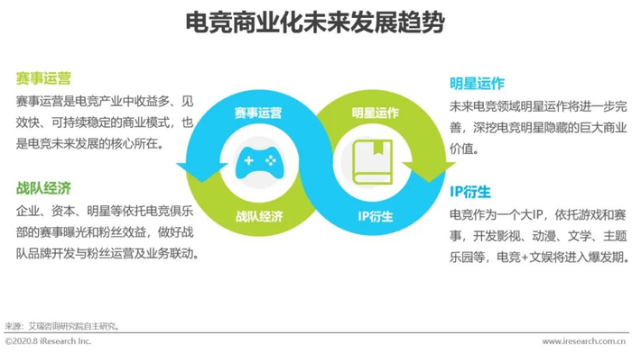 在未来,电竞商业化将以赛事运营为核心,依托战队经济和明星运作,扩大电竞行业影响力并提升社会认可度。同时,以丰富的IP衍生内容,提升电竞用户的综合体验和情感投入,达到品牌营销运作的更好效果。电竞商业化的发展将反哺电竞产业,促进电竞产业稳健增长。