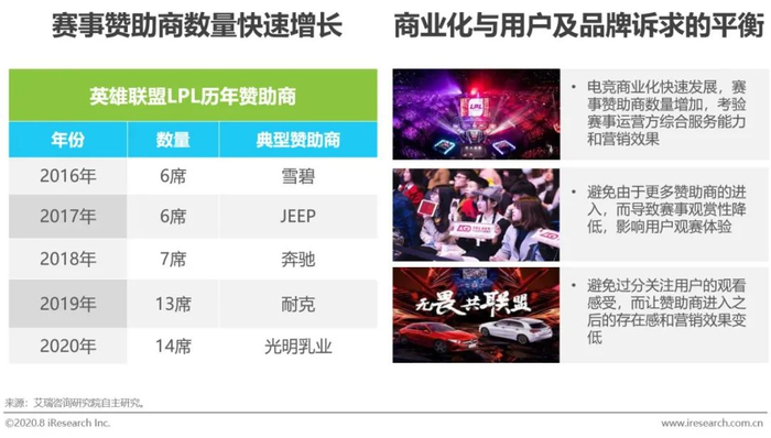 随着电竞赛事影响力迅速扩张和成熟度提升,电竞商业化发展也处于快速推进的阶段。以LPL赛事为例,赞助商数量从最早的几席到现在的十四席,增长非常迅速。赞助席位逐渐饱和后,未来赛事方将以更优质的品牌效应与曝光效果,来提升赞助金额。如2020年6月,苏宁易购成为LPL官方合作电商平台,赞助金额已达数千万元,上涨趋势明显。另外,如何平衡赞助商诉求与电竞用户的观赛体验,达到一个良性发展,也是考验赛事内容方的关键点。