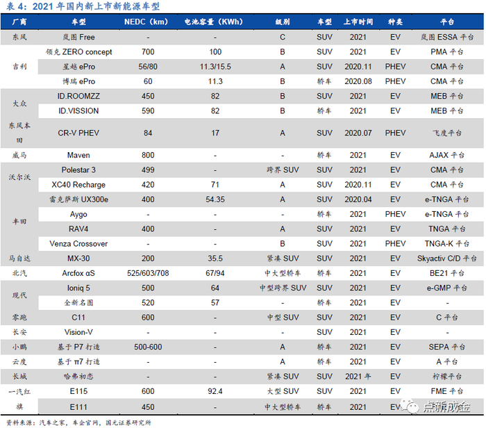 从国内市场来看,除主要车企高端电动子品牌在2021年集中上市交付以外,造车新势力新车型上市,包括Tesla Model Y、蔚来EC6、零跑C11等,以及滴滴与比亚迪合作开发的专门满足运营端需求的车型D1、更多类似宏光mini替代低速电动车市场需求的车型,极大丰富电动车产品品类,有望孕育更多爆款车型。