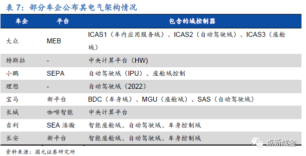 电动化过程催化汽车从EEA(电子电气架构)走向CCA(计算与通信架构)。升级后的电子电气架构首先便于实现软硬件解耦,实现软件层面在域控制器上的整合,让OTA(包括FOTA)升级变得更加便利;其次可以降低智能汽车复杂度、提升开发效率,将4-5年的开发周期减少一半;最后通过减少高压线束、优化空间,降低成本,提高自动化率。大众MEB和MQB软件架构最大差别在于:MQB采用分布式电气架构,MEB采用域控制电气架构。ID.4搭载了三大域控制器统领全车的电子电气架构,将几十个ECU大幅精简为几个大的域控制器,集成度仅次于特斯拉Model 3。在长安最新宣布与宁德时代华为联合开发的车型,同样采用三个域控制器(座舱、智能驾驶和电动系统)以及三个操作系统(鸿蒙HOS,自动驾驶操作系统AOS,和车控操作系统VOS)。