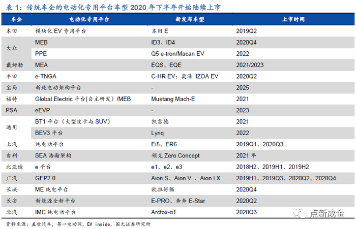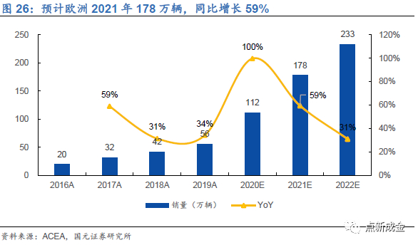 2021年欧洲与国内投放纯电车型数量较2020年翻倍增长,销量有望大幅增长。纯电平台后期将持续成为整车厂研发能力、成本、市场竞争的焦点所在。