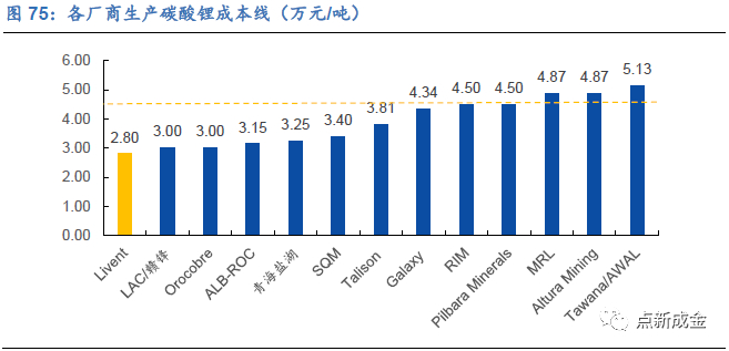 碳酸锂价格下行时,西澳锂矿率先面临经营压力。从成本线来看,按照目前4.5万元/吨的碳酸锂售价,只有Greenbushes、Mt Marion这两座成熟矿山具有一定的成本优势,且分别与天齐、ALB和赣锋、MRL有稳定的包销渠道,因此尚未面临明显的经营压力。Livent旗下的阿根廷Hombre Muerto 盐湖具有高锂浓度、低镁锂比等得天独厚的优势,且率先实现选择性吸附法的工业化,其碳酸锂生产成本为2.8万元/吨,是唯一生产成本低于3万元/吨的盐湖。