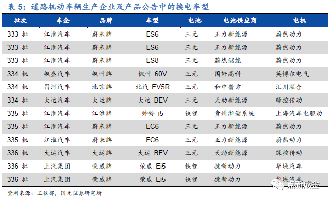 国内蔚来汽车、威马汽车、吉利汽车、北汽、长安、哪吒汽车和上汽集团等多家车企积极布局换电。换电车辆申报提速,蔚来、吉利汽车、北汽昌河、大运汽车等换电车型进入应用推广目录。第334、335、336批公告中出现9款换电车型,吉利旗下的枫盛汽车、上汽荣威Ei5均申报了换电车型。一汽2021年预计会有2个快换车型(红旗牌和奔腾牌)推广上市。
