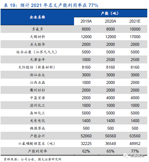 六氟磷酸锂供应端缺口刚性,价格向上趋势或持续。生产六氟磷酸锂对生产安全与环保要求较高,需要具备氟化工技术背景的厂商才能保证竞争力,一般新增产线的建设周期在18-20个月,主要在于环保审批周期、认证周期较长以及生产设备与产能爬坡问题。总体来看短期很难形成新产能,且根据公开信息,主流企业中目前仅有天赐材料有6万吨扩产规划,其他企业暂无新建产能规划,短期看供应端难以增加。根据测算,预计2019年-2021年六氟磷酸锂的需求为3.2、3.7、4.9万吨。根据统计,2019-2021六氟磷酸名义产能分别为5.21、5.66、6.36万吨;考虑到天赐在建产能及爬坡问题,实际2021年产能约在5-6万吨,实际产能利用率约在82%-98%,2021年全年总体供应偏紧。