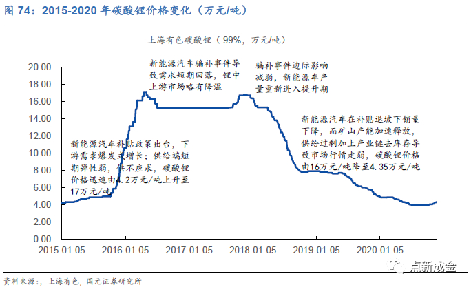 碳酸锂价格经历了四个阶段:1)从2015年下半年开始,随着新能源汽车井喷式发展,碳酸锂的价格从4.2万元/吨快速上涨至17万元/吨左右。2)2016年开始,下游需求出现短期回落,碳酸锂价格下滑至15万元/吨左右。3)2017年,因产业链企业在价格上行阶段积压库存,造成碳酸锂短缺的现象,价格居高不下。4)从2017年年底开始,需求不及预期,前期投资的锂矿步入产能兑现期,供需矛盾突出,碳酸锂价格进入下行通道。