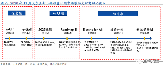 传统整车巨头加速转型电动化。随着动力电池成本下降,电动车产品盈利趋势明确,并且各国鼓励电动车消费限制燃油车,各大传统车企巨头如大众、通用、戴姆勒、宝马等加快电动化脚步,在众多车企宣布的2025规划中,对电动化转型的投资额纷纷达到百亿美元。其中以大众最为典型,大众于2016年6月、2017年9月分别发布“Together-Strategy 2025”和“Roadmap E”确定集团层面进行电动化转型,“Roadmap E”规划到2025年推出超过80款电动车,到2030年旗下所有车型均至少有一款电动车。于2018年9月、2019年11月分别发布“Electric for All”和未来投资规划。前者首发专为电动车开发的MEB平台;后者将电动化2020-2024年投资比例从30%提升到40%,约330亿欧元,到2029年电动车累计销量提升至2600万辆。在2020年11月公布的总额为730亿欧元的全新5年投资计划中,大众的电动化投资额提升至350亿欧元,以此加速整个集团的转型。同时2020年11月,通用汽车官方宣布将在电动车和自动驾驶领域加大投入,未来五年规划投资270亿美元,投资力度超过其燃油车项目,2025年底前将在全球推出30款电动车型。至此主要国际车企均宣布未来5年的电动转型计划,未来5年将是车企全面电动化转型的关键阶段。