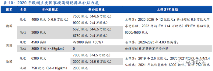 欧洲新能源单车补贴约6000欧元,德法英意主要国家提升补贴预算。2020年开始特别是疫情扶持政策下,欧盟层面及欧洲主要汽车销量国家纷纷提升对新能源车补贴力度。2020年7月21日欧盟通过7500亿元复苏计划法案,其中大量资金用于绿色转型。德国宣布2020-2025年总预算12亿欧元新能源汽车补贴基础上,将全面提高单车补贴25%-50%,电动车单车补贴最高到9000欧元。法国新能源汽车补贴总预算从2019年2.6亿欧元提升至2020-2022年分别4、4、3.4亿欧元,5月底宣布增加80欧元援助计划,将单车补贴6000欧/辆增加至7000欧/辆。意大利将总补贴预算由2019年的6000万欧元提升至2020-2021年的7000万欧元。此外瑞典、荷兰等国家均提高补贴力度。