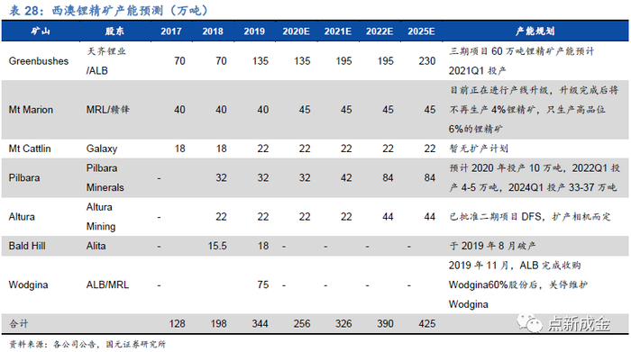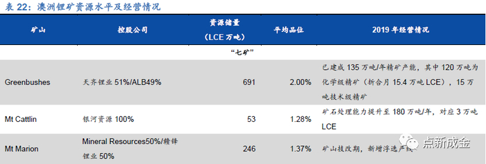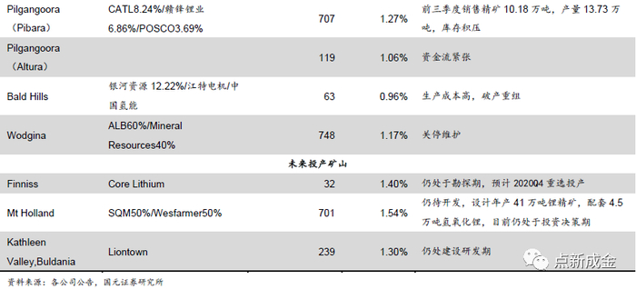 西澳锂矿是全球最大的锂源,部分矿场已减产或破产。澳洲具备投产能力的主要矿区包括七座,其中Greenbushes是全球探明储量最大的硬岩锂矿床,2019年锂精矿产能约为18万吨LCE,资源品位优质,且具有成本优势,2019年锂精矿营业成本仅781元/吨,远低于同行业竞争对手。Mt Marioan的储量丰富且成本相对较低,是赣锋锂业目前锂原材料最主要的来源;Mt Cattlin探明资源储量较小,遵循“边开采、边勘探”的策略延长开采寿命;Pilgangoora(Pibara)资源储量丰富但品位偏低,与众多的蓝筹客户建立了长期合作关系,包括赣锋锂业、通用锂业和长城汽车等;Wodgina因成本较高,锂价低迷的情况下难以产生经济效益,已于2019年10月开始关停维护;Pilgangoora(Altura)与众多中国客户签订了包销协议,受制于较高成本而深陷困境,2020年10月被以多家美国对冲基金为主的贷款方置入破产托管,随后宣布被皮尔巴拉矿业收购;Bald Hills因控股公司Alita发生债务违约,已于2019年8月开始进行破产重组。预期未来澳洲会有四个新矿山进入投产阶段,其中Mt Holland储量丰富,品位仅次于Greenbushes,预计将成为新增产能的主要供给。