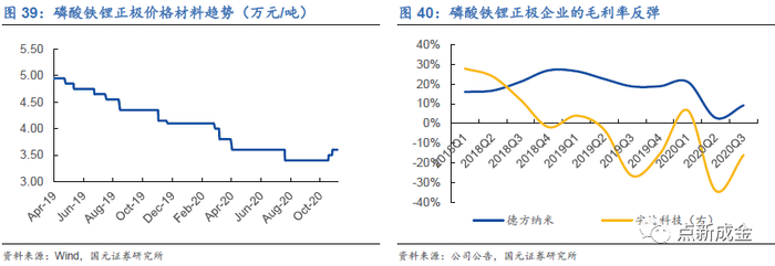 磷酸铁锂价格逐渐企稳回升。2019年以来磷酸铁锂正极材料从4.95万/吨持续下滑,截至2020年10月下降至3.4万/吨,2020年11月磷酸铁锂正极价格回升至3.6万/吨,环比提升5.88%。从单季度磷酸铁锂正极企业盈利端来看,厂商毛利率在Q3出现反弹。龙头企业德方纳米2020Q3毛利率为9.18%,安达科技2020Q3毛利率为-16.07%,盈利能力触底恢复。