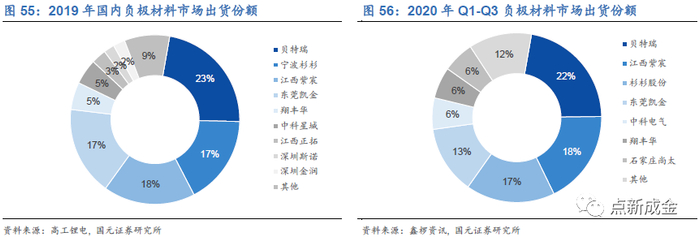 2020年CR3市场份额稳定,东莞凯金市场份额下滑,翔丰华与中科电气市占率向上。2020年前三季度,负极材料CR5为76.55%,相比2019年下降了2.82个百分点,行业格局保持稳定。二梯队玩家市场份额变化较大,东莞凯金市占率相比2019年大幅下降4.23个百分点,预计主要原因是受到疫情影响以及受日韩电池企业入局后动力电池市场份额变化影响,大客户宁德时代装机量与份额有所下降;中科电气和翔丰华市占率均小幅提升1个百分点至6%,此后随着电池企业引入新的材料供应商,预计二梯队企业市占率仍有提升空间。