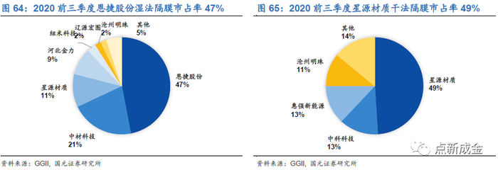 湿法隔膜龙头恩捷股份得益于规模和成本优势,2020前三季度市占率47%。在湿法隔膜领域,国内的主要生产商有上海恩捷、苏州捷力、中材中锂、星源材质等,随着恩捷股份在2020年3月完成了对苏州捷力的收购,恩捷股份的市占率进一步提高,国内湿法隔膜的竞争格局逐渐呈现出一家独大的趋势。