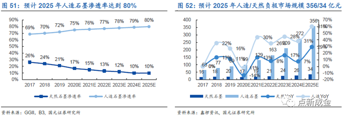 受益下游应用快速增长,负极材料持续高增长,预计2025年人造石墨市场规模356亿元。2019年全球负极需求量20.8万吨,同比增长21%;预计2025年负极材料需求达到96万吨,其中人造石墨达到77万吨,天然石墨和其他品类负极各9.6万吨;负极市场规模达到462亿元,人造石墨负极356亿元,天然石墨34亿元,其他负极71亿元。