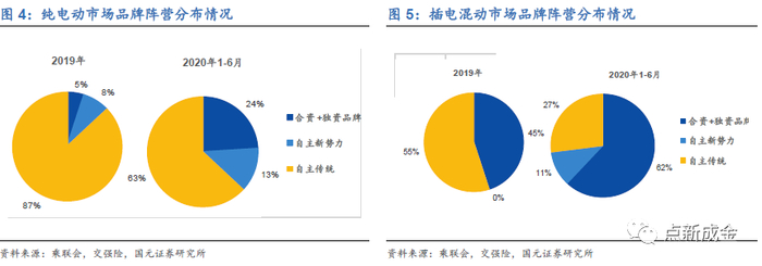 从品牌阵营来看,新势力与合资品牌新能源占比提升。纯电动市场,特斯拉迅速崛起;合资品牌的新能源汽车产品投放提速,启动追赶模式;传统自主品牌受挤压,市场份额从2019年的87%下降到2020上半年的63%。插电混动市场,合资品牌布局逐步加深,市场份额从2019年的45%上升到2020上半年的62%;自主新势力表现突出,逐渐上量。