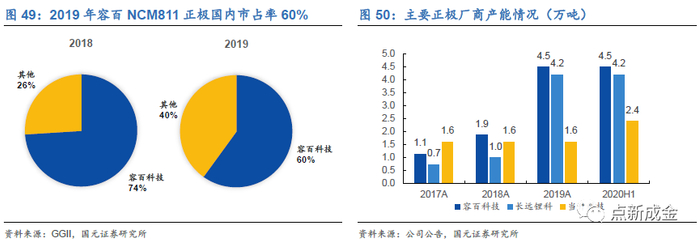 宁德时代引领811高镍正极推广,三元高镍正极出货占比已达16%。NCM811动力电池产品较NCM523产品能量密度高25%,预计产品优化可提升至30%以上。从国内三元正极出货量的结构来看,截至2020年上半年仍以5系为主,占比71.6%,8系占比15.7%。高镍正极材料自2016年开始导入,宁德时代2019年开始大规模的应用,需求逐渐爆发。当前趋势在于宁德时代将继续引领高镍811在国内的推广,如海外版ID.4 搭载了LG化学研发的NCM712电芯,而国内则统一搭载了宁德时代的NCM 811电芯。