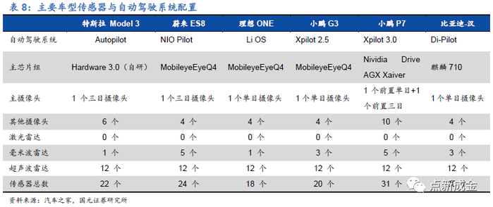 “智能电动车”作为全新的品类逐渐被消费者认知,智能化成为产品差异化竞争的核心策略。智能化的标签也不断提升公司的产品力和品牌力。当前主要的电动智能标签的热门车型所有在售车型都标配众多传感器、芯片算力、识别系统等,硬件的冗余方便后续的智能化升级。特斯拉用高性能芯片将用来控制和支撑特斯拉的自动驾驶系统、动力传递和车辆娱乐等功能,打造高性能电动车和自动驾驶两大核心竞争力。2020年发布的小鹏P7所搭载的14颗200万像素摄像头+5颗博世第五代毫米波雷达+英伟达Xavier 30 Tops算力自动驾驶芯片组合被视为行业解决方案领军者。