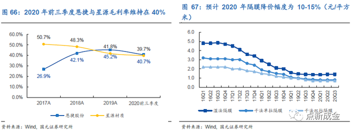 星源材质盈利能力显著提升。折旧成本在隔膜成本中占比近3成,星源在湿法隔膜产品均价下降28.74%至1.24元/平方米的背景下,平均成本下降至0.75元/平方米,毛利率提升至39.73%。19年隔膜降价25-30%,目前湿法基膜半成品价格1.4-1.6元/平;由于行业新产能释放,20年隔膜降价幅度预计为10-15%,而龙头恩捷成本0.7-0.8元/平,毛利率仍有40%以上。