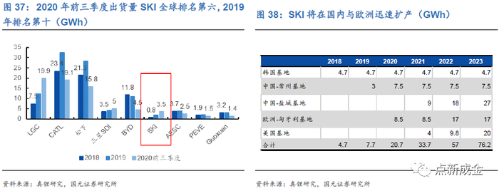 2020年SKI快速放量,市占率有望快速上升。SKI通过绑定现代-起亚共同成长,起亚最初的BlueOne和Rya车型都由SKI开发电池。目前SKI基本覆盖现代企业全部车型,2017年成为戴姆勒核心供应商,2013年与北汽成立合资公司,北美市场供货福特及大众MEB平台。SKI在国内常州与盐城基地共规划产能35GWh。19年8月SKI宣布在中国江苏常州建立动力电池厂,投资50亿元,预计年产能达7.5GWh,2020年投产。同时19年底在盐城启动建设,规划产能27gwh。