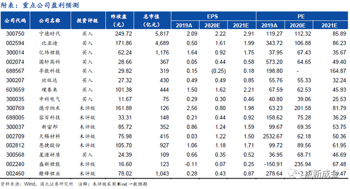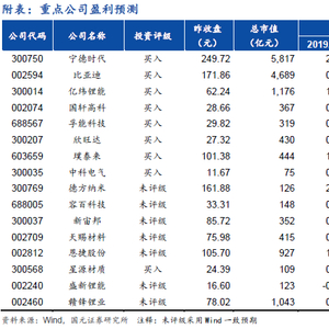 1)全球锂电龙头持续溢价及二线玩家客户突破,关注宁德时代、亿纬锂能、国轩高科、孚能科技、欣旺达。2)关注供需变化及产品价格趋势性企稳回升带来的盈利改善:正极环节,德方纳米、容百科技;负极,关注璞泰来,中科电气;电解液(六氟磷酸锂)环节,新宙邦、天赐材料;隔膜:恩捷股份、星源材质;锂盐:盛新锂能、赣锋锂业。