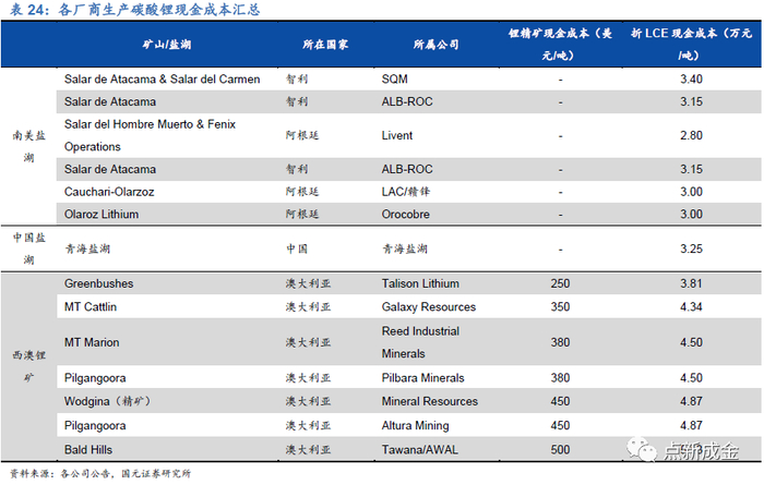 碳酸锂的现金成本由低到高依次为南美盐湖、中国盐湖和西澳锂矿。主要假设为:1)盐湖提锂考虑权益金(ALB和SQM需要按照销售价格向智利政府支付累进制的权益金,ALB需支付的比例最高可达3.5%);2)8吨锂精矿能制取1吨碳酸锂;3)锂精矿制取碳酸锂的加工成本为2.5万元/吨;4)美元兑人民币汇率为6.57。由此得到的现金成本由低到高依次是:南美盐湖、中国盐湖和西澳锂矿。