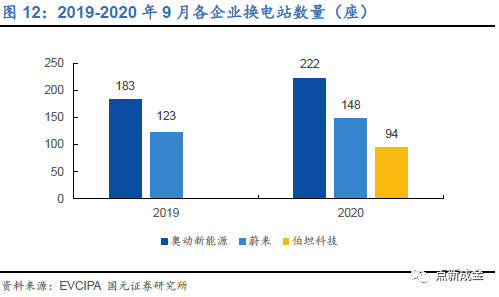 受益于各家车企投入,换电站数量快速增长。截至2020年9月,全国新能源汽车换电站保有量为464座,其中奥动新能源222座(以与北汽合作为主),占比达49%,蔚来和伯坦科技分别为148座和94座,相对2019年底306座保有量,增长迅速。蔚来的第二代NIOPower换电站将在2021年落地并投入运营;蔚来计划在三年内在中国建成1000座换电站。北汽集团则以出租车和网约车作为切入点,计划在2021年6月底前,与国网电动合作建设100座换电站,服务全国不少于1万台换电车辆。吉利科技集团2020年计划将在重庆建设完成35座换电站;2021年,吉利科技集团将在重庆建成100座换电站,2023年计划落成200余座换电站,将重庆打造成换电示范城市。