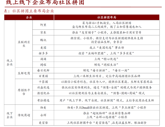 从更高的角度,社区团购或许是电商进一步打开下沉市场的流量入口,龙头电商/互联网公司会借助社区拼团高性价比的特点,打开下沉市场,从生鲜拓展到全品类,逐步提升在下线城市的电商渗透率,因而具有战略意义。