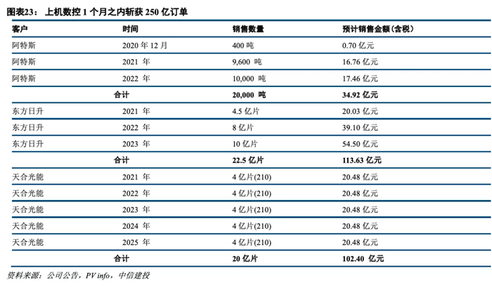 从产能看,公司2020年底13GW单晶硅项目将全面达产,预计至2022年产能将达到20GW以上。从客户看,11月初至今,上机数控披露的重大合同总金额达到250亿元(与东方日升签订113.63亿元、22.5亿片硅片长单,与天合签订210尺寸单晶硅片每年4亿片,5年总计20GW,102.4亿元订单,与包头阿特斯签订20,000吨单晶方锭,预计销售金额总计34.92亿元订单)。判断公司作为硅片后浪“新势力”,有望在行业向“更大更薄”变革之际,把握发展机遇,实现快速增长。