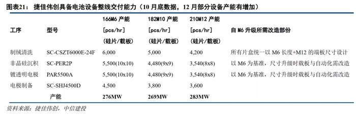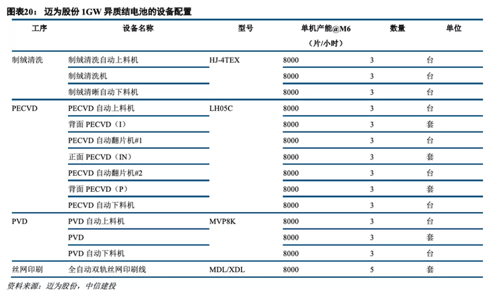 在第一道清洗制绒环节,公司采购了两台YAC、两台捷佳设备;PECVD环节,采用了一台迈为的设备(8000片/小时),一台捷佳/理想的设备(5200片/小时),两台钧石的设备(4500片/小时);PVD环节,采用了一台迈为的设备,一台捷佳/佰立恒的设备,两台钧石设备;丝网印刷环节,采用4台迈为的设备,1台捷佳的设备。