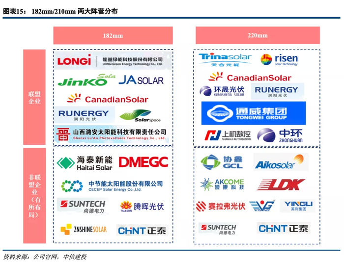 行业内已基本形成182/210两个阵营。经历了一年多的时间,大尺寸光伏生态链日渐完善。除上述企业外,协鑫、爱旭、通威等电池制造商也同样入场,适配210产品的支架、接线盒等相关配件均已做好匹配。2020年6月,阿特斯、润阳、中宇光伏、晶澳、晶科、隆基、潞安七家企业通过联名信的方式建议建立尺寸为182*182mm的硅片标准,并希望在行业标准组织中将这一尺寸纳入标准规范文件。其后的11月27日,天合、东方日升、阿特斯、环晟光伏、通威、润阳、中环、上机数控八家企业发布《关于推进光伏行业210mm硅片及组件尺寸标准化的联合倡议》,建议在210-220mm尺寸范围内,选择SEMI标准中确定的硅片尺寸:210+/-0.25mm作为唯一尺寸同时依照这个硅片尺寸修订SEMI以及光伏行业协会已有的组件尺寸标准。