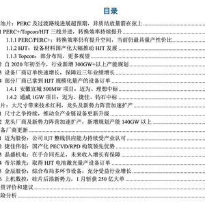 部分厂商已拿到HJT规模化量产订单:2020年最受关注的HJT招标包括山煤1GW、华晟500MW和通威1GW项目。综合以上中标情况,我们发现在整线供应环节,迈为/捷佳有一定的技术优势。而在PECVD单环节,理想也有一定的优势。得益于设备厂商单机产能的提升,HJT单线规模从之前的50MW提升至200-400MW,为产线的降本做出了较大的贡献。