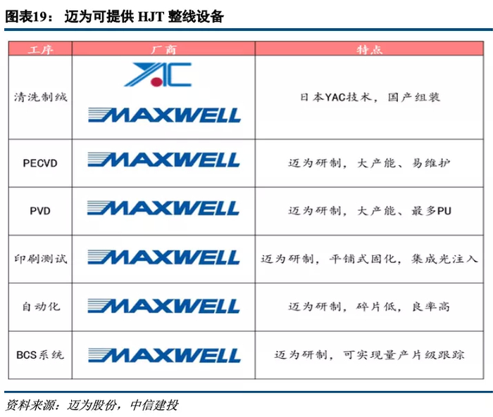 此外,我们观察到在HJT领域,具有综合解决方案能力的设备厂商开始涌现,其中以迈为股份和捷佳伟创最为突出。迈为股份当前已经实现非晶硅镀膜、TCO膜沉积、丝网印刷、自动化的完全国产化,并已经通过合作的方式实现清洗制绒环节的部分国产化,可以完全提供turnkey解决方案;而捷佳伟创也已经基本实现清洗制绒设备/PECVD/RPD/丝网印刷设备的国产化,具备整线提供能力。