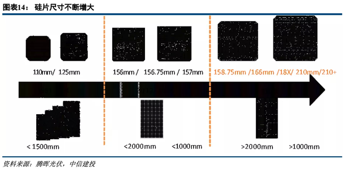 ②就设备而言,从规模维度看,目前市场上约有近100GW 166及以下尺寸的产能,大多无法直接升级至210;从时间维度看,仅2018-2019年左右投产的产能,部分可以改造至210mm尺寸;最后从尺寸的选择来看,近几个月规划的产能大多选择210mm向下兼容;